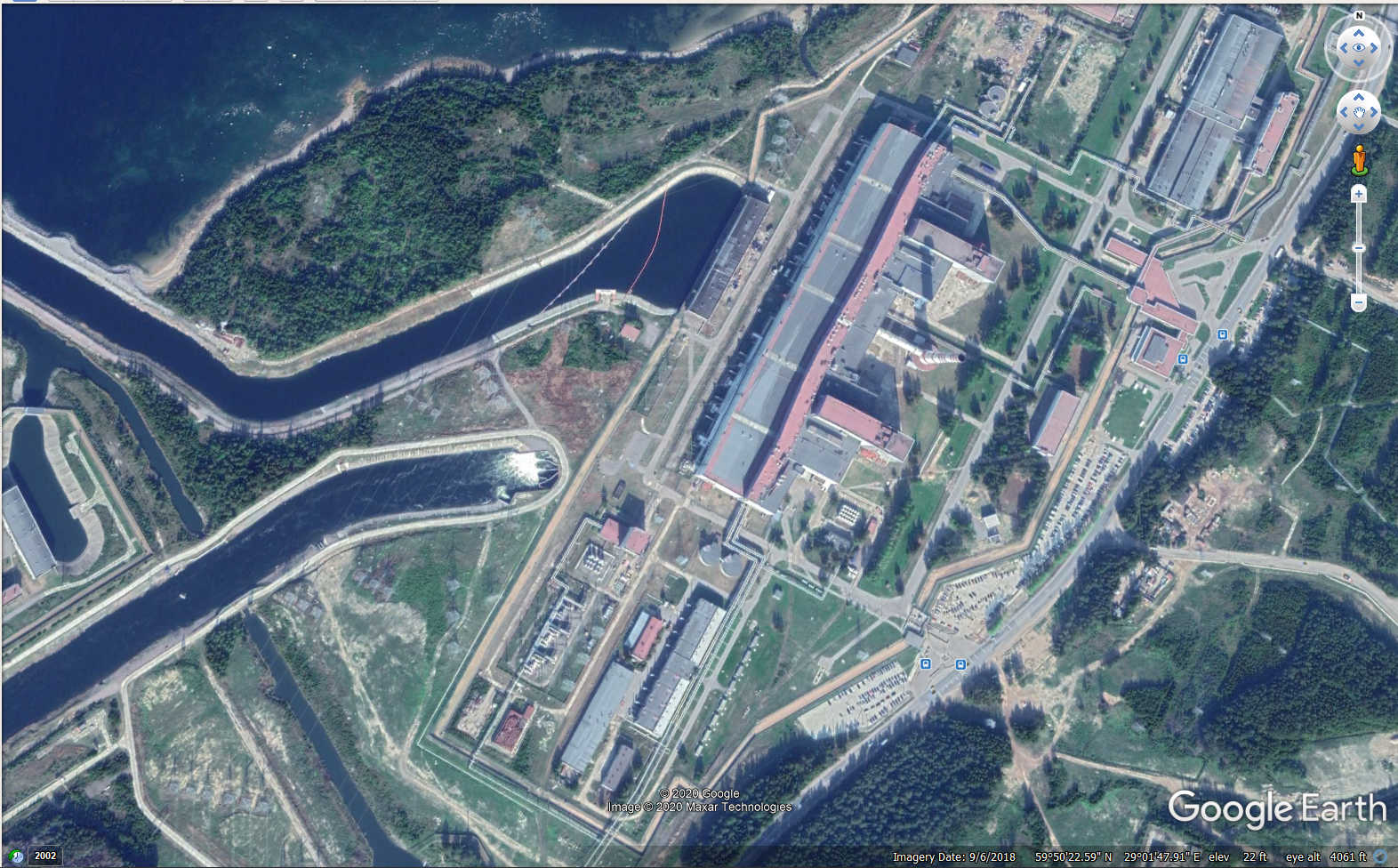 Below, Leningradskaya-1. Two RMBK-1000 reactors are in the long building at the top, two more in the building at the bottom. The cooling water outlets show flowing water, so they are in operation in this image. Leningrad 1-1 was shut down in 2018, and fuel unloading is expected to be complete in 2023.